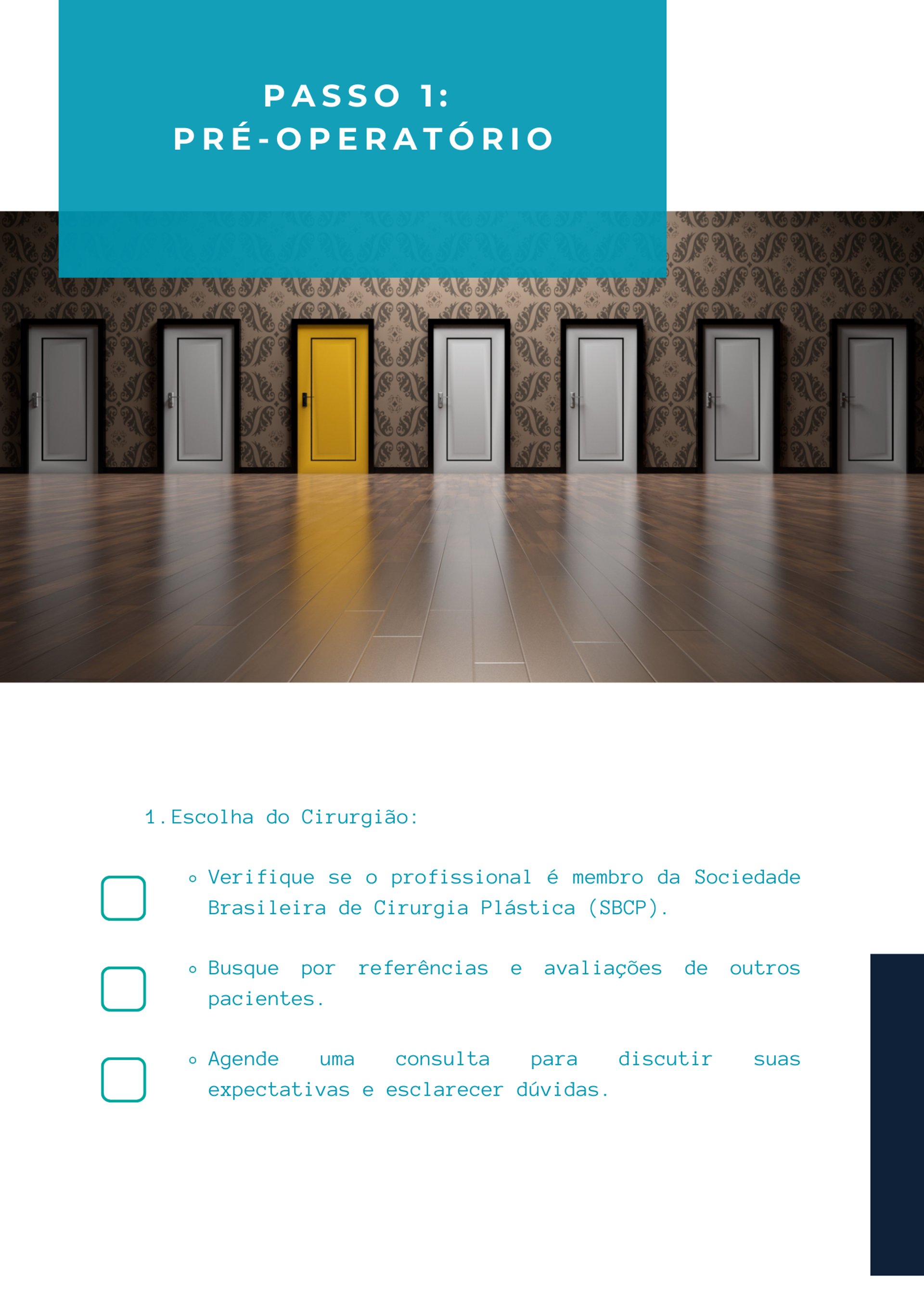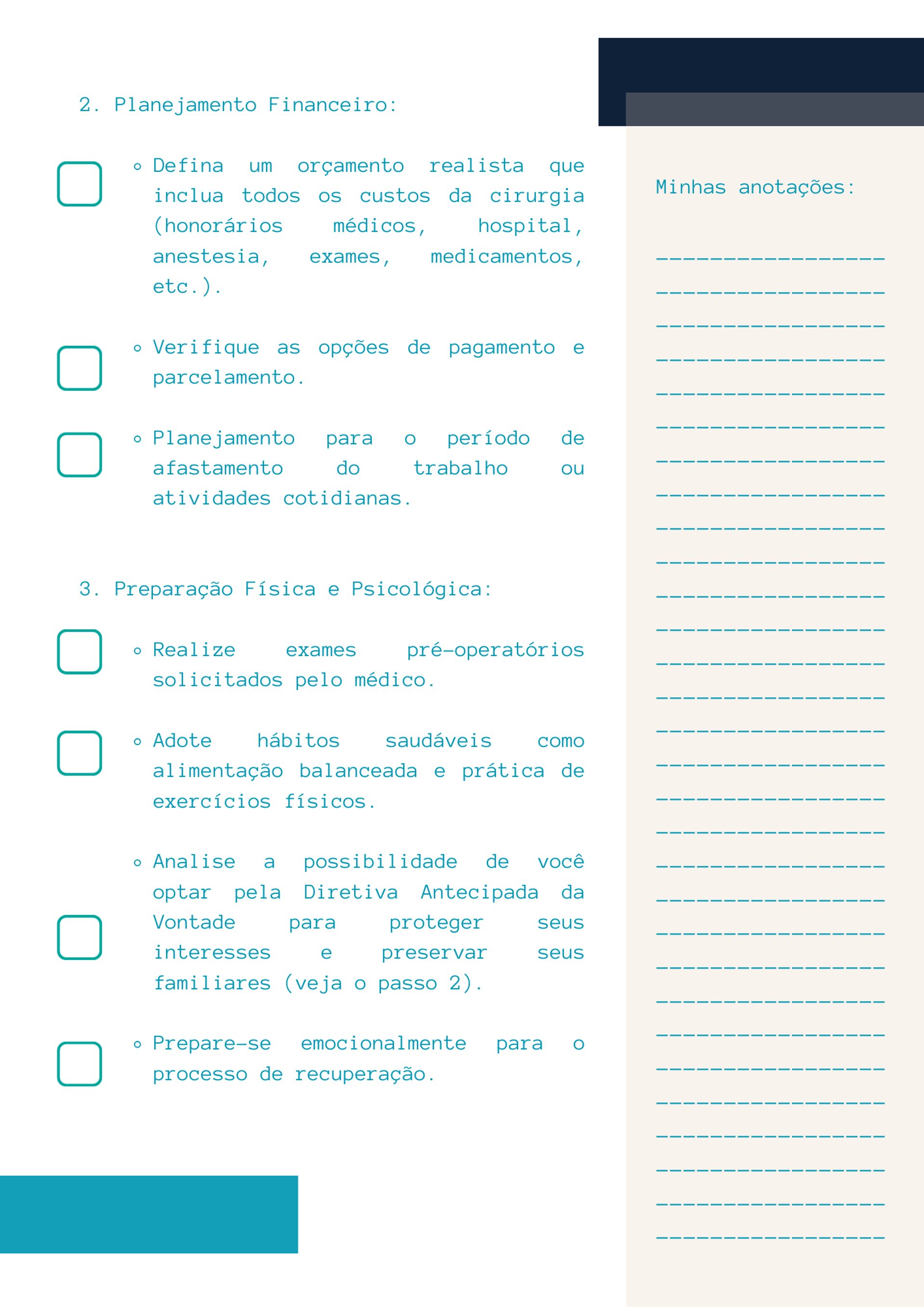 Este checklist (passo a passo), com 28 páginas, oferece um guia prático para você que pretende realizar uma cirurgia plástica de forma eficiente e segura sobre: